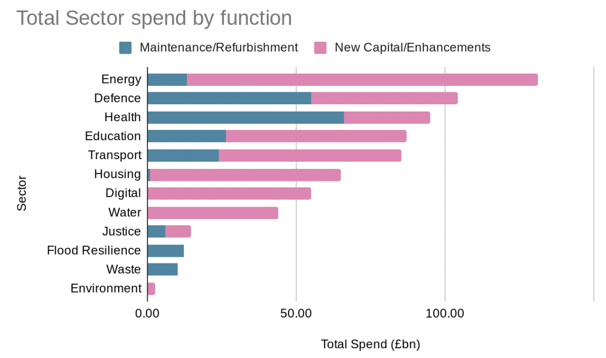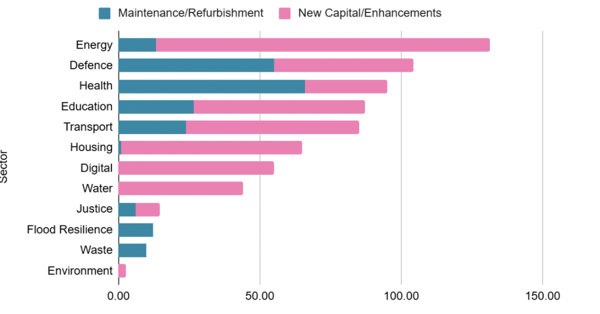 This is heavily weighted towards building new capital stock although there are also extensive funds dedicated to maintaining and repairing existing assets. Roughly ⅔ of the overall settlement is intended to construct new infrastructure. This varies by sector however. Energy and defence are the overall winners. Both sectors are set to receive over £100bn.